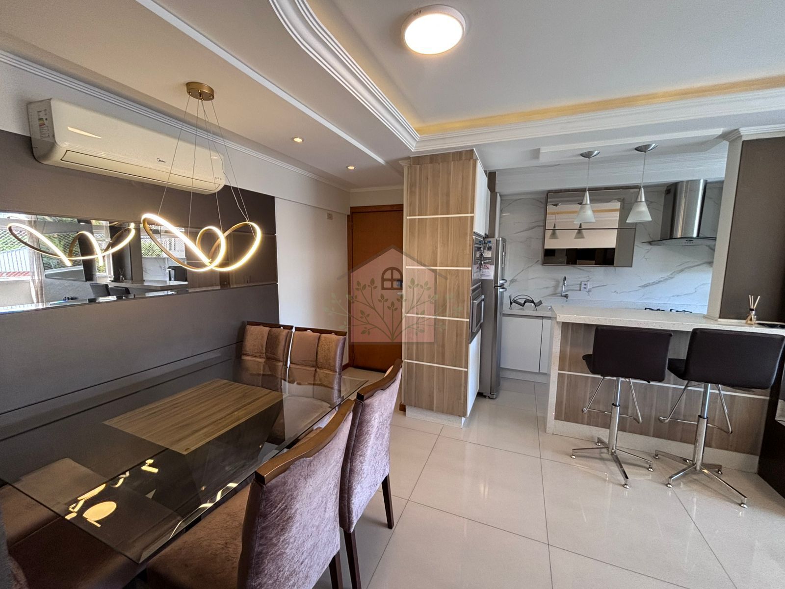 Permanece todos os móveis sob medida, além de mesa de jantar completa, sofá, 2 TVs, micro-ondas e forno de embutir, geladeira, fogão, coifa, máquina lava e seca, 2 aparelhos de ar-condicionado e cortinas.