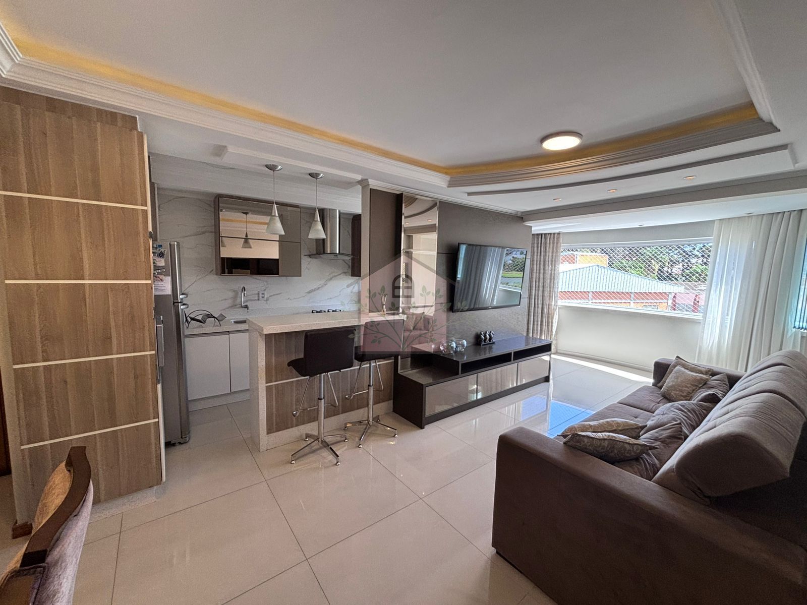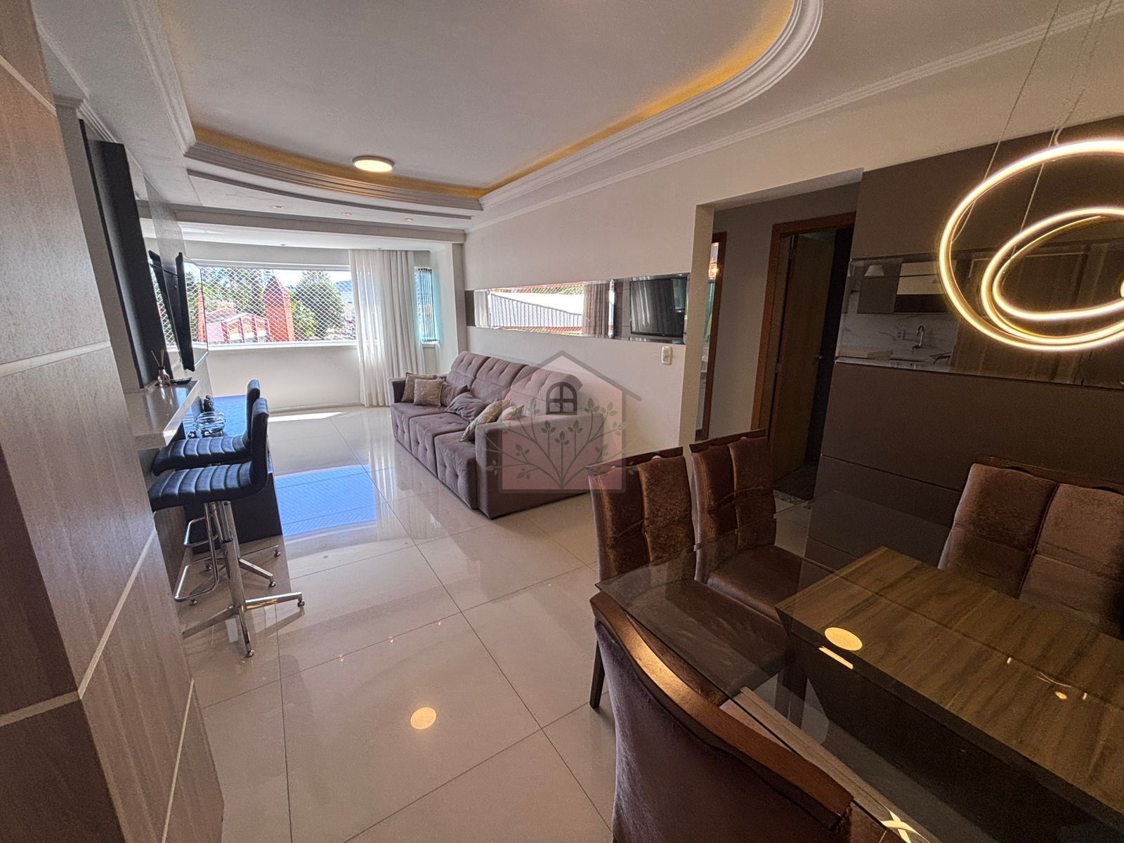 Living integrado com mesa de jantar, cozinha e sala de estar com sacada estendida e churrasqueira;