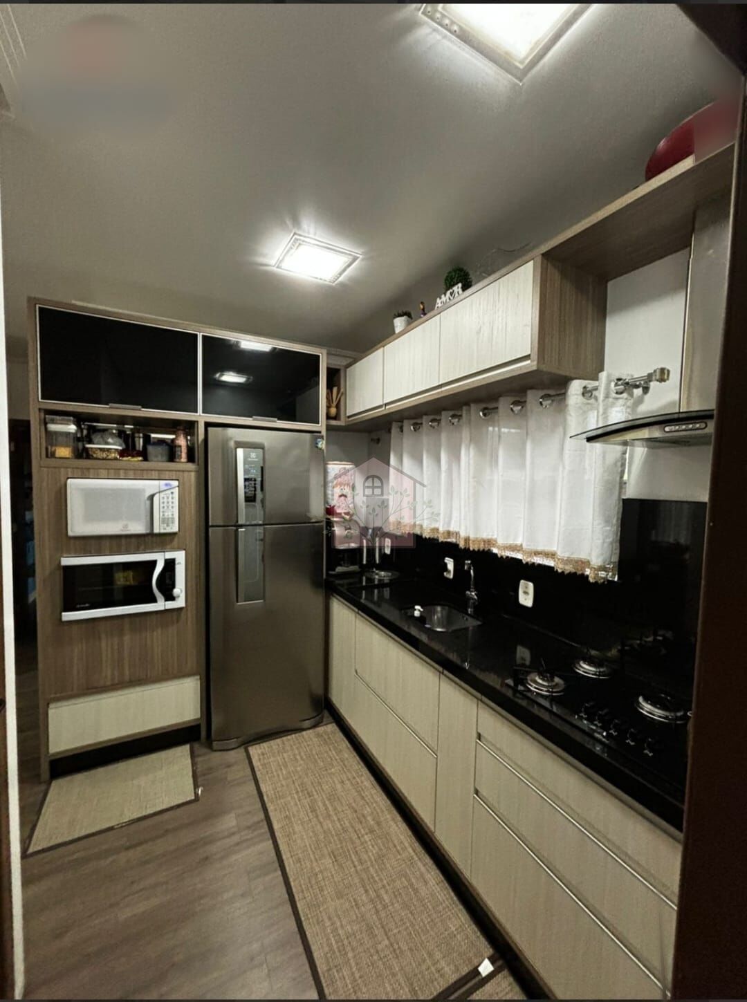 Permanecem os móveis sob medida, lustres, fogão e coifa.