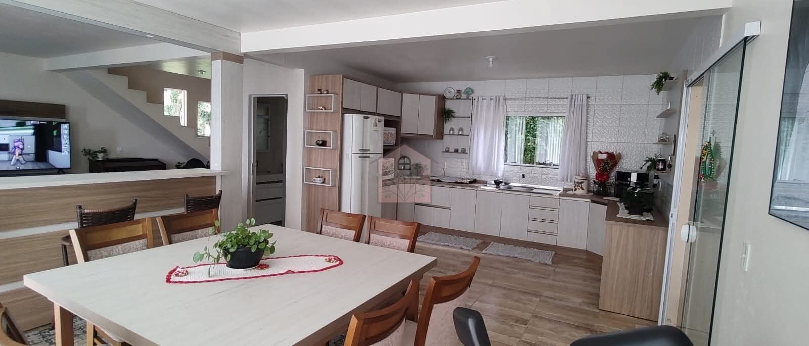 Sala, sala de jantar e cozinha integrados;